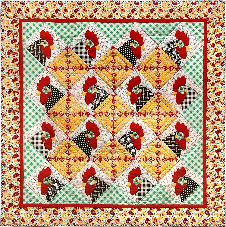 Sixteen rooster heads in profile and set on point with easy pieced single Irish chain blocks. Fat quarter friendly, features both applique and pieced blocks.